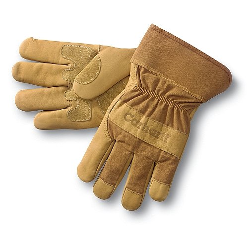 If youre looking for awesome gloves, youve come to the right place! Completely ready for work, these men's Insulated Leather Palm Gloves with Grain Cowhide by Carhartt are durable and dependable. Made of 8 ounce, 100% cotton duck, and featuring G100 Thinsulate® Insulation, these gloves will keep you warm in the coldest conditions. With grain cowhide palms, and extended suede cowhide and palm patches for reinforcement, these gloves also feature a safety cuff for easy on and off, and the Carhartt logo is debossed right across the knuckles.