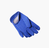 50% polyester, 50% cotton jersey. Polyester foam lined. Gunn cut with straight thumb. Has an open cuff with shirred elastic for snug fit. Assorted tan and navy.