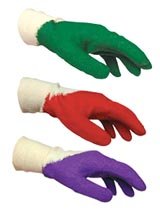 - Latex rubber coating, cotton jersey gove. Your choice of green, red or purple (lilac) dip, on white