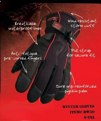 BSX Gear BW50 Medium Winter Work Glove 1 PairPart # BW50-MBSX Winter Work Glove - BW50Thelook and feel of a ski glove at a fraction of the cost, BSX BW50 winterwork gloves offer a tough pigskin palm with a waterproof liner.BSW Winter Work Glove Features:Pigskin palmMultiBlend insulatedSure grip reinforcementsCurved fingersBreathable waterproof linerStorm cuffSnug spandex/neoprene fitSize - Medium